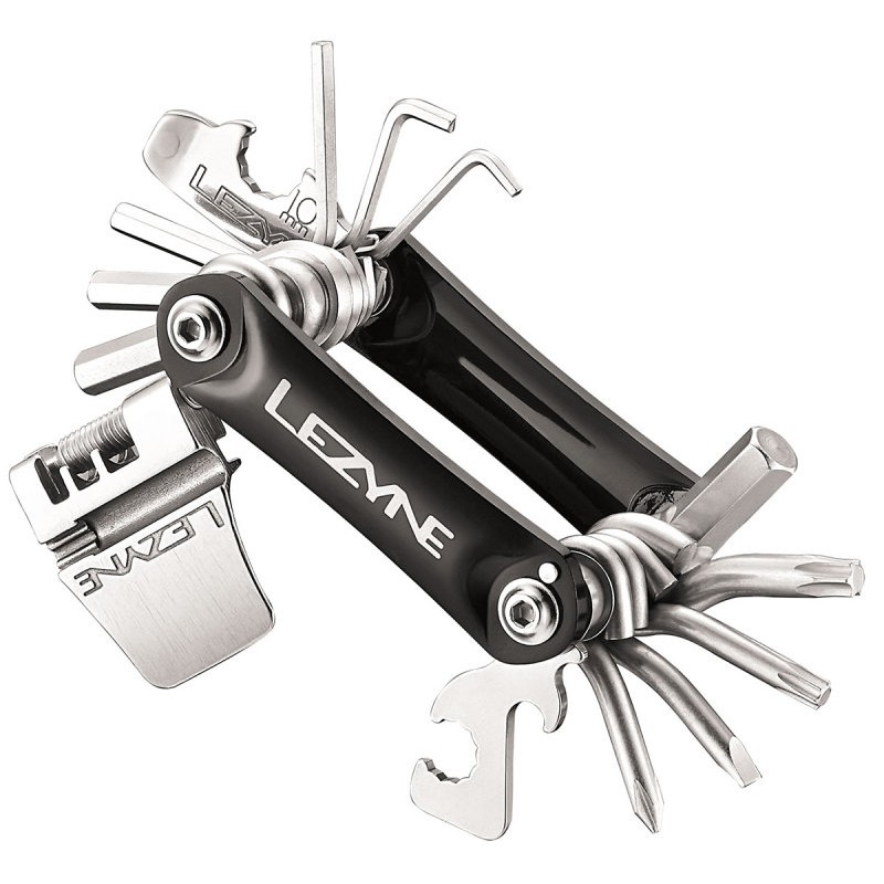 Выжимка цепи удобна не менее чем профессиональная и рассчитана на работу с 8, 9, 10, 11 скоростей. Аварийная лопатка поможет вам при разборе колеса в случае прокола. Ключи для спиц, трёх размеров, справятся в случае необходимости с появившейся «восьмеркой» в пути. Набор шестигранников 2, 2,5, 3, 4, 5, 6, 8 мм, ключи Torx T25 и T30, отвертка крестовая и плоская, ключ для развода колодок, открывалка для бутылок — это всё что собрано в практичном, стильном наборе складных ключей.