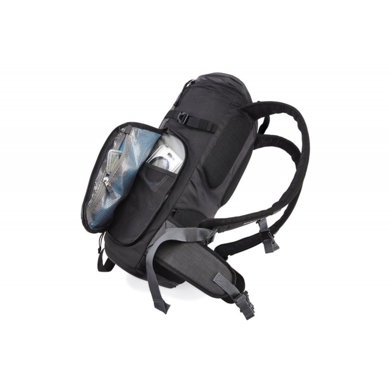 Рюкзак пошит из нейлона с водоотталкивающей поверхностью. Дополнительную защиту от влаги предоставляет дождевая накидка, которая имеется в комплекте. Для наиболее удобной посадки шлейки рюкзака стягиваются ремнем на груди, широкий поясной ремень усиливает плотность посадки. В рюкзаке присутствует основное отделение для личных вещей, отделение SafeZone с возможностью его изъятия для хрупких аксессуаров и два скрытых кармана. Спереди есть крепление для коврика или снаряжения.